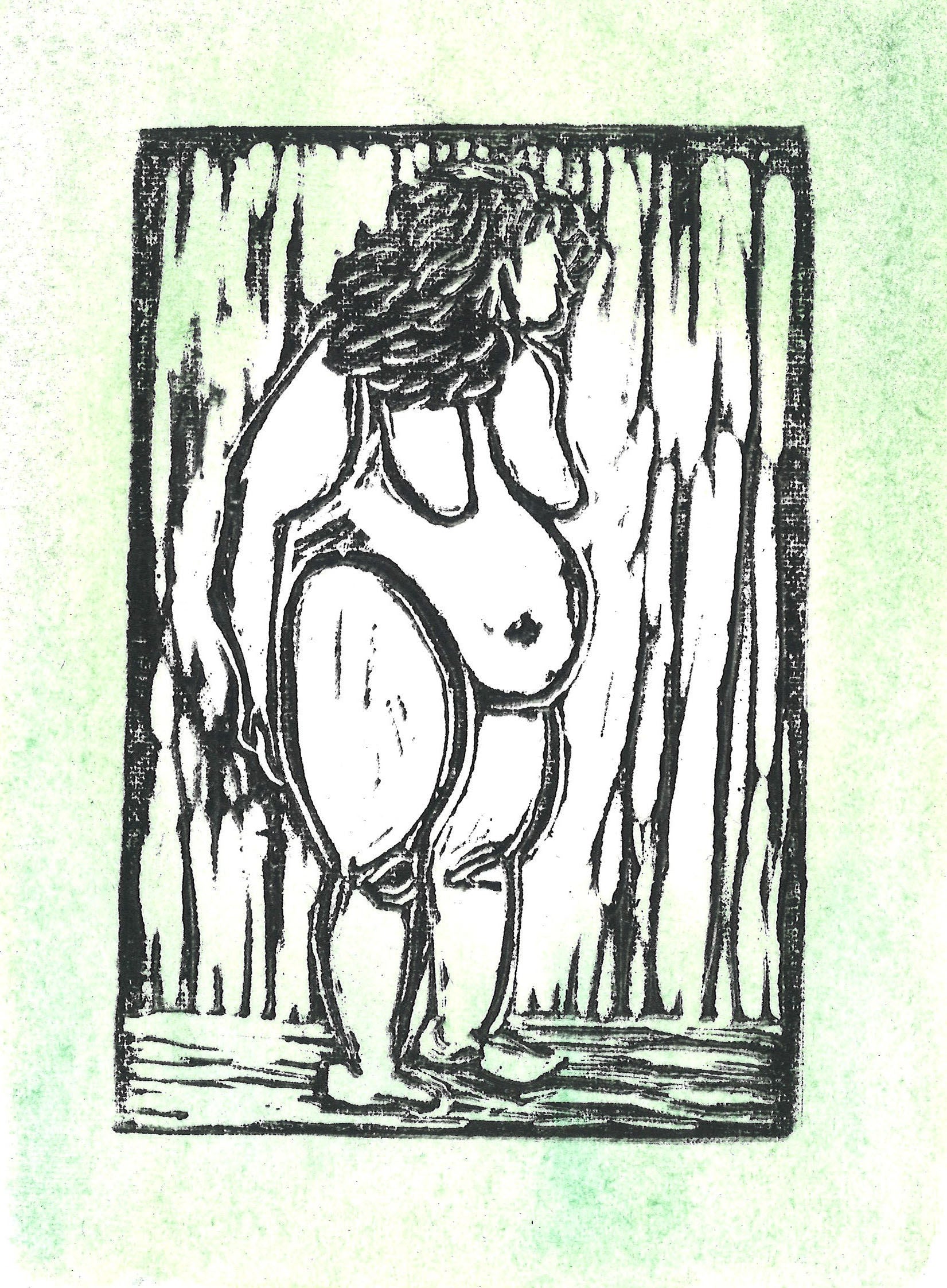 Original linocut print using water based printing ink on and glitter watercolor background on mixed media paper. Full page measures 6”x 8” and would be suitable in a 5”x7” frame. Each print is a little different as the ink takes to paper differently.